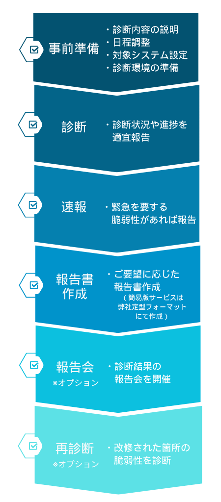 診断ツールの効率を活かしながら、ご認知や識別しにくい脆弱性を、経験豊富なエンジニアによって徹底的に手動で調査します。